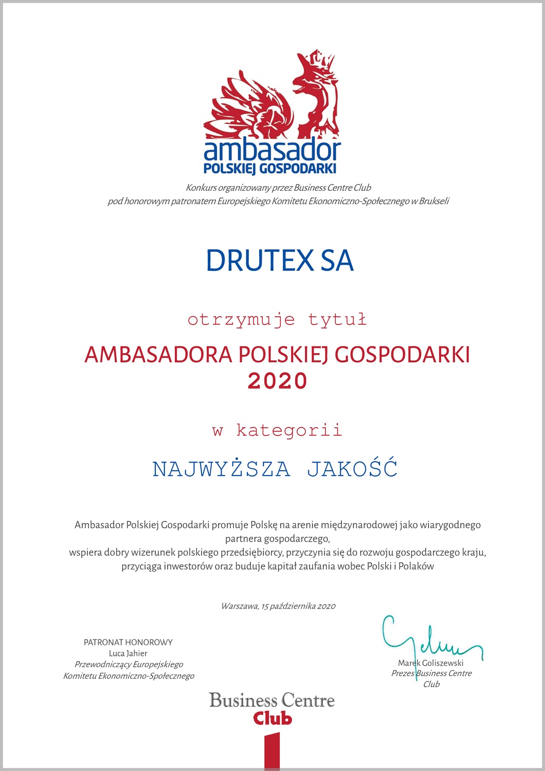 DRUTEX has been recognized for top quality of the products sold all over the world. The company is the ‘Ambassador of Polish Economy’ in the ‘Top Quality’ category. The contest has been organized by the Business Centre Club, and the honorary patron is the European Economic and Social Committee in Brussels.