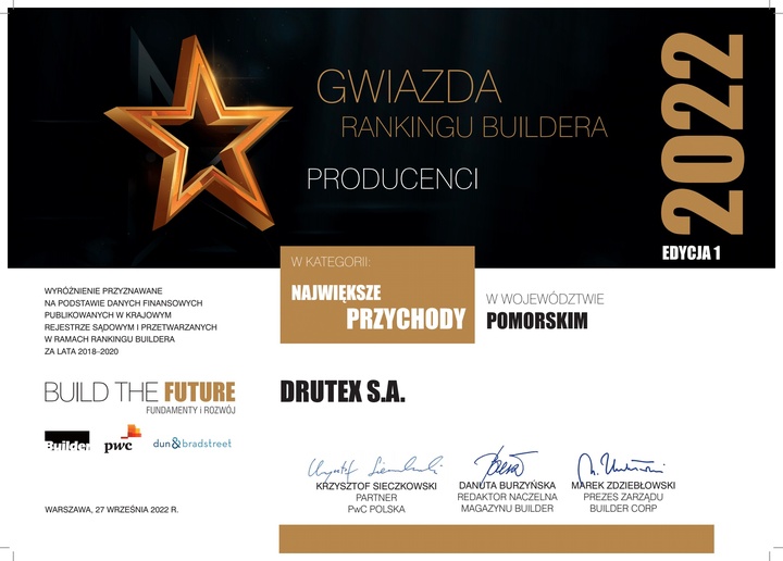 We have just received another award. This time, we obtained the prestigious ‘Star of Builder’s Ranking’ title in the category ‘The Highest Income in Pomeranian Voivodship’ among companies that produce construction and finishing materials.
