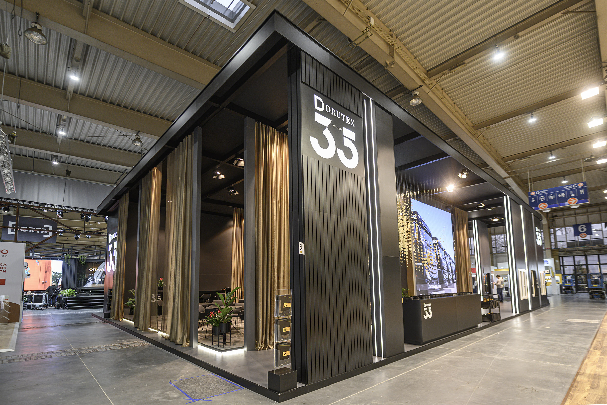 Drutex, celebrating this year its 35th anniversary, has prepared an exceptional stand for the Budma exhibition. On 300 square meters the company set up friendly space to showcase its products, with perfectly integrated meeting zone. This year Drutex stand definitely dominates at the Poznan exhibition. The design draws visitors to learn about the company offer. The stand features an impressive LED screen showing Drutex visualizations and pictures, and an effective installation was mounted above elegant display stands with the company products. Black and white colors combined with plant elements and diffused light build an atmosphere of elegance and prestige, and they emphasize the strength of Drutex brand. Drutex’ stand at the Budma exhibition obtained the Acanthus Aureus award yet again. The previous award for best design of exhibition space was given to the company in 2019.
